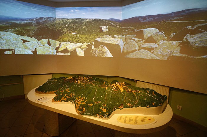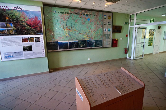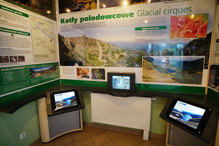 Byłem pod wrażeniem zakresu informacji jaki jest tu przekazywany. Wydaje mi się, że omówiono lub pokazano każdy zakątek Karkonoszy, każde ważne wydarzenie w historii i każde zjawisko w nich zachodzące. Możemy więc przeczytać np. o muflonach, które sprowadzono tu na początku XX w. z Korsyki i ich populacja wciąż żyje, a także o rozwoju lotnictwa na Śnieżnych Kotłach. Jeden z terminali zawiera wielką bazę zdjęć Karkonoszy, które wyświetlają się po wpisaniu odpowiedniego kodu. Taki sposób prezentacji na pewno wzbudzi zainteresowanie dzieciaków, ale nasz syn dosyć szybko się znudził. Informacje przeznaczone są jednak dla trochę starszych turystów.
