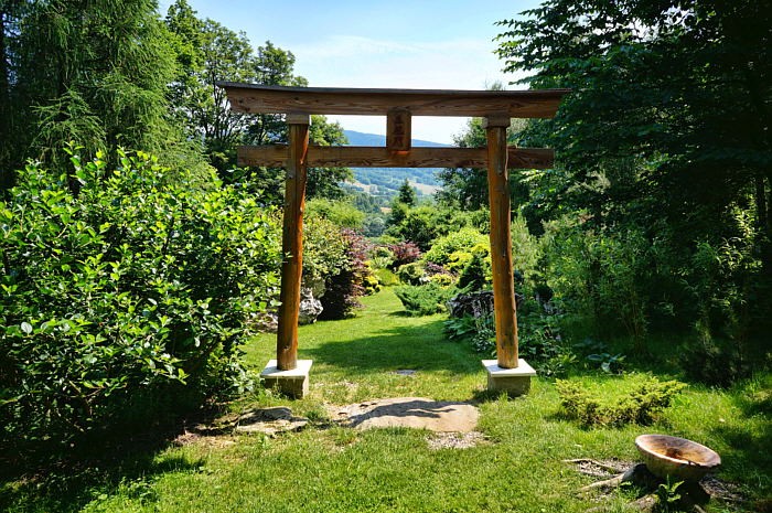 Nie zmienia to faktu, że ogród, choć niewielki, jest bardzo ładny. W najwyższym jego punkcie spośród roślinności przebijał się widok na pobliskie pasmo górskie, więc liczyłem że z tarasu widokowego na Wapienniku będzie się rozpościerać wspaniała panorama. I tu spotkał mnie wielki zawód, bo okazało się, że na szczycie budowli zagnieździły się trzmiele czy coś podobnego i artyści szanując prawa owadów postanowili im nie przeszkadzać, więc turyści mają tylko wstęp na parter. OK, szkoda tylko, że nie informuje się o tym przed wejściem, albo przy sprzedaży biletów.
