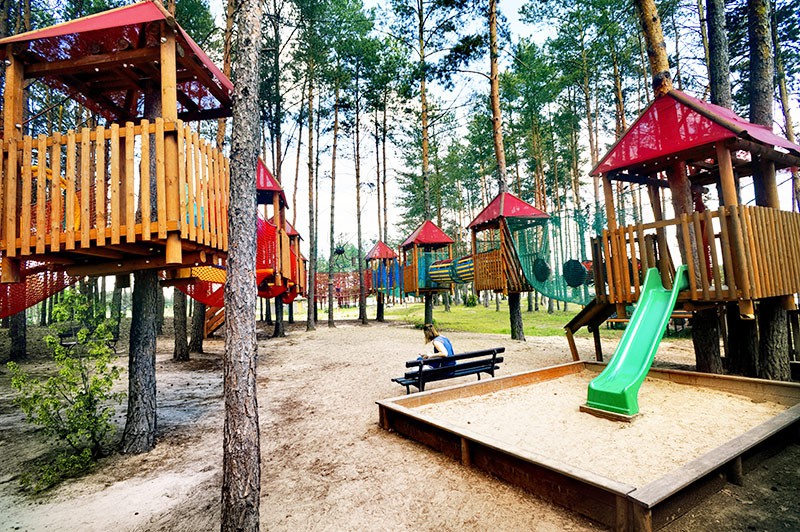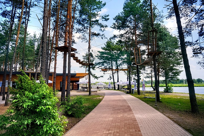 Z tyłu stoi wysoka drewniana konstrukcja zwana Wieżą Mocy. Potraktowaliśmy ją jako punkt widokowy, ale jest przeznaczona dla ludzi szukających mocnych wrażeń: skoki, zjazdy, wahadło itp. Szkoda, że widok jest ograniczony przez drzewa, widać tylko plażę, kąpielisko i fragment zalewu z wysepkami. To nas jednak zachęciło do sprawdzenia co jest po drugiej stronie zalewu. Okazuje się, że ścieżka jest całkiem przyjemną trasa spacerową. Za mostem i wypożyczalnią sprzętu prowadzi ona na największą wyspę, gdzie mieści się hotel i exit room, dalej jest przystań żeglarska i jakiś hotel. Reklamują w nim pizzerię, ale nie była czynna.