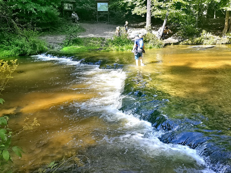 Drugie wejście na szlak jest wcześniej - przy mostku gdzie umieszczono ławkę i jakby malutką przystań, z której również można zejść do rzeki. A woda jest tu spokojna i dobrze widać jak krystalicznie czysta. Po przejściu mostka trzeba iść drugą stroną rzeki i po chwili wejść na szlak żółty pod górę piaszczystą ścieżką. To jednak dobra trasa na powrót - nie trzeba wspinać się po piaszczystej drodze i nie ma mapki szlaku, którą lepiej zobaczyć na starcie.