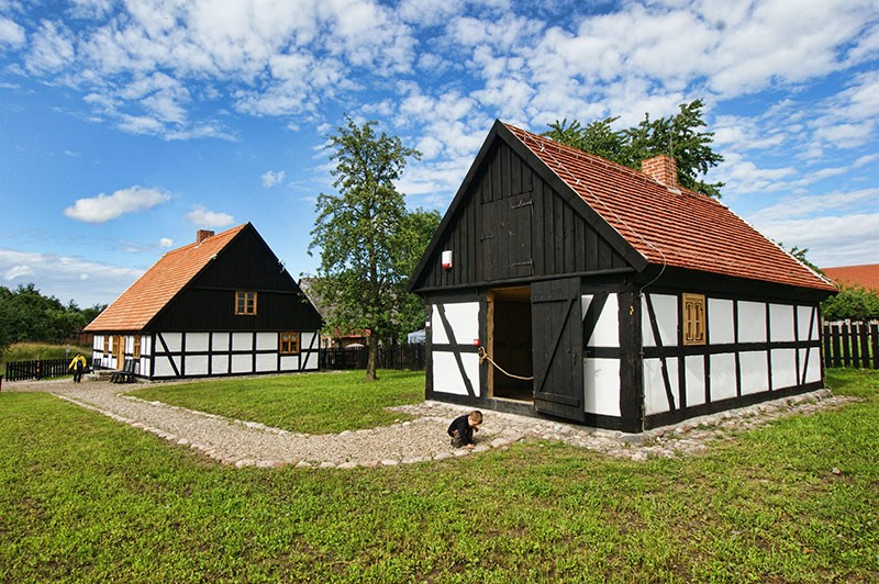 Swołowo to niewielka miejscowość sprawiająca wrażenie, jakby była z innego świata. Zachowana duża ilość szachulcowych budynków, potoczek, staw, niewielki kościółek, droga z kocich łbów. Wszystko to sprawia, że nagle czujemy się jak na obrazach Chełmońskiego. I w zasadzie już samo to mi by wystarczyło do pełni zachwytu. Okazało się jednak, że ta miejscowość ma do zaoferowania znacznie więcej. Pośród tego szachulcowego budownictwa poukrywane są obiekty muzealne. Ich obecność jest do tego stopnia wkomponowana w tę niesamowitą przestrzeń, że nawet niezauważalna. W sumie są to 3 zagrody skupiające kilkanaście budynków. Warto zwiedzić wszystkie, oglądnąć kościółek, przejść się od położonego przy nim mostka wzdłuż strumyka nad staw.