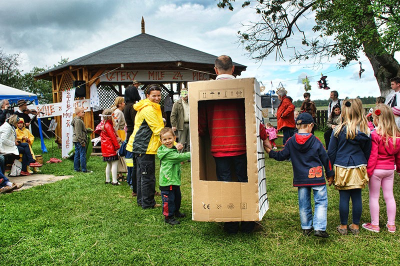 Muzeum bardzo dba o najmłodszych. Mieliśmy okazję obejrzeć – czy raczej wziąć udział w spektaklu teatru ze Słupska "Cztery mile za piec" (w 2012 odbywał się w każdą lipcową niedzielę). To nie tylko teatrzyk. Aktorzy angażują w występ dzieci i rodziców, i chociaż nie jestem fanką tego typu atrakcji, to nawet poprzebierana w dziwne stroje i wywołana na scenę bawiłam się naprawdę dobrze. Oczywiście nikt nie jest do niczego zmuszany, ale radosna atmosfera łatwo się wszystkim udziela. Dodatkowo aktorzy przywożą ze sobą świetne zabawki, których nawet nie potrafię nazwać, takie co to bawiła się nimi prababcia. Nasz syn najbardziej upodobał sobie staroświeckiego cymbergaja. Planują odwiedzenie Swołowa z dziećmi warto więc sprawdzić kiedy odbywają się tego typu imprezy.