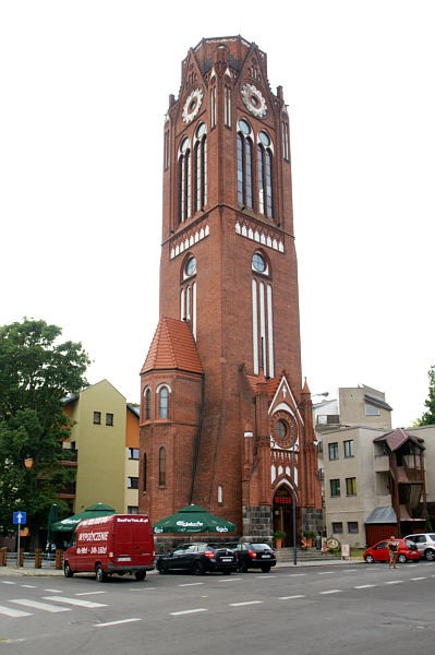 Wieża kościelna znajduje się niedaleko rynku miejskiego, 1 km od części nadmorskiej Świnoujścia. Została bardzo ciekawie zagospodarowana. Wnętrza robią wrażenie, są pięknie i stylowo urządzone. Aż się prosi aby usiąść tu na chwilę i skorzystać z oferty kaw czy deserów. My akurat nie mieliśmy na to czasu. Powyżej części kawiarnianej znajdują się kondygnacje przeznaczone na galerię sztuki. Było tam jakieś mało ciekawe malarstwo. Kilka obrazów wisiało, ale większość niedbale położono na podłodze. Dalej mamy kondygnacje ze starymi zdjęciami w antyramach, też nic ciekawego, choć neogotycka architektura wieży z okrągłymi i podłużnymi oknami jest interesująca.