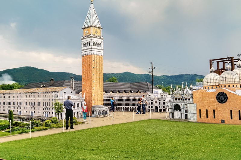 Park położony jest na zboczu wzgórza co zmusza nas spacerów górę i dół, ale nie jest to uciążliwe. Podzielony jest mniej więcej pół na pół, na część z miniaturami i urządzeniami do zabawy. Miniatury są wykonane perfekcyjnie, widać to szczególnie na bazylice św. Marka w Wenecji, na której pieczołowicie odtworzono freski i zdobienia. Fajnie jest spojrzeć na całość Akropolu (wzgórze można oglądać z kilku miejsc) czy pochodzić w miniaturowym Watykanie. W strefie krajowej zobaczymy nie tylko znane zabytki, ale także góry, schroniska, Stadion Narodowy czy statki. Uroku parkowi dodają oczka wodne i potok, który spływa między makietami (jest on wykorzystywany np. do napędzania koła młyńskiego w miniaturowej wsi) oraz piękna roślinność z mnóstwem kwiatów. Do tego wszystkiego po fragmencie parku kursuje minikolejka z mostami i tunelem. Więc cała kompozycja parku po prostu zachwyca!