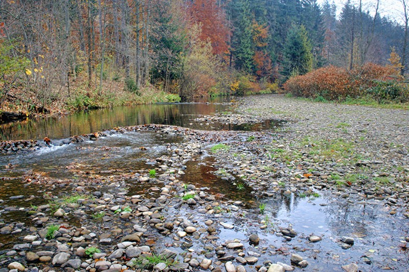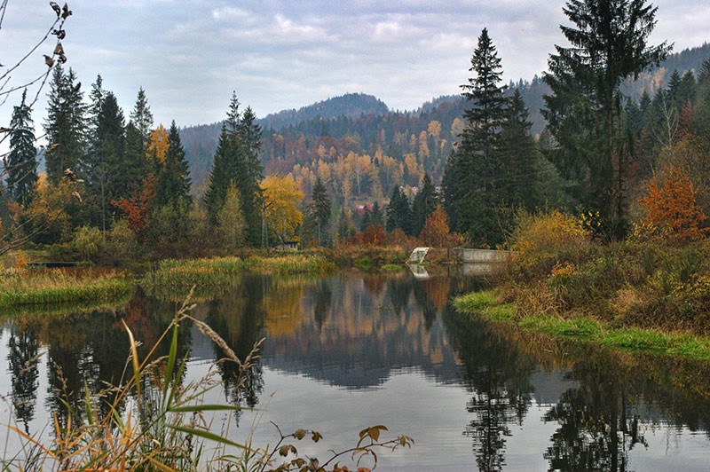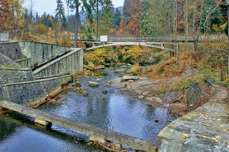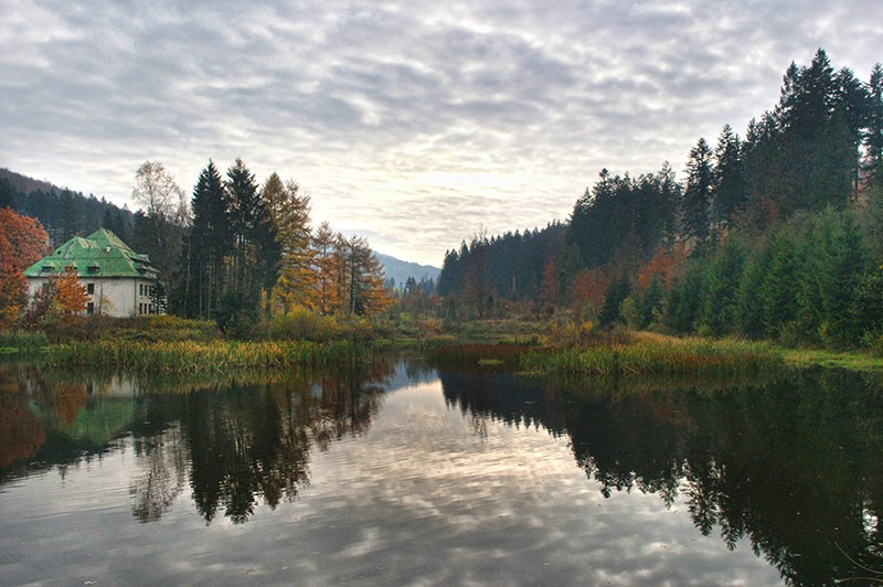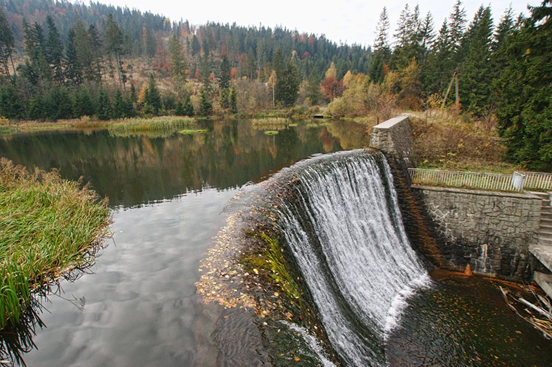 Okazało się, że to tzw. Mała Zapora przy ośrodku PTTK. Miejsce robi wrażenie, niestety jest opustoszałe, ponieważ budynek schroniska stoi w ruinie. Właściwie to jest w remoncie, ale żadnych prac nie widać. Szkoda, bo wygląda na zabytkowy i nieźle wkomponowuje się w krajobraz. Nie przeszkadza to jednak w przespacerowaniu się wokół zalewu. Widoki na lekko zarastające jezioro i góry są bardzo ładne. Ścieżka doprowadzi nas do płytkiego koryta Czarnej Wisełki - typowego górskiego potoku pełnego kamyczków, którymi dziecko może się trochę pobawić. W lecie jest to pewnie dobre miejsce na rozłożenie się nad wodą z maluchem. Tutaj przekroczyliśmy rzekę i wróciliśmy drugą stroną jeziora na parking przy wodospadzie. Droga biegnie po grobli otoczonej jesienią złocistą roślinnością. Szkoda, że takie miejsce się marnuje...