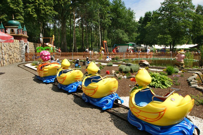 Z płatnych urządzeń dzieciakowi podobała się mała kolejka górska, niestety odjeżdżała ona rzadko, raz na pół godziny, jak nie rzadziej. Fajne są małe pojazdy, wprawiane w ruch kiwaniem się. Z innych rzeczy dla maluchów jest jeszcze: kolejka brzydkie kaczątko jeżdżąca dookoła ogródka z oczkiem wodnym, wahadłowa łódź piracka, letni kulig, a dla trochę starszych: park linowy, żyroskop, strzelnica z łuku do narysowanych dinozaurów. Ten kulig to kolejka zrobiona z połączonych sanek na kołach ciągnięta przez traktor. Jeździ cyklicznie po terenie parku i kawałek za bramą. Nie wiem na czym polega jej atrakcyjność, ale dzieciakom, sądząc po reakcjach, bardzo się podoba. Nasz jechał sam, ale można z rodzicem.