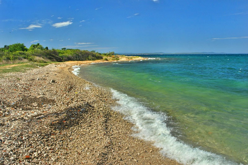 Plaża żwirowa i betonowa, ale na spory odcinek wysypano piasek, więc dzieci mają tu dużo radości. Jest kilka punktów gastronomicznych i sprzedawców lodów. Ośrodek ciągnie się kilkaset metrów, z jednej strony kończy się dużym cyplem z trochę dzikim i odludnym terenem, a z drugiej strony wyjściem do drogi. Dalej jest kolejny odcinek plaży, choć trochę innego rodzaju. Nie wiem czy to już sąsiednia miejscowość czy tylko przedmieścia Zadaru, ale z turystycznego kotła przenosimy się do małego, sennego, nadmorskiego miasteczka z mariną, plażą i kilkoma rzędami ładnych domków. Drogą co jakieś 10 minut przejeżdża samochód, w oddali słychać dalmacką muzykę, a nieliczni plażowicze opalają się rozłożeni co ok. 20 metrów przy bulwarze.