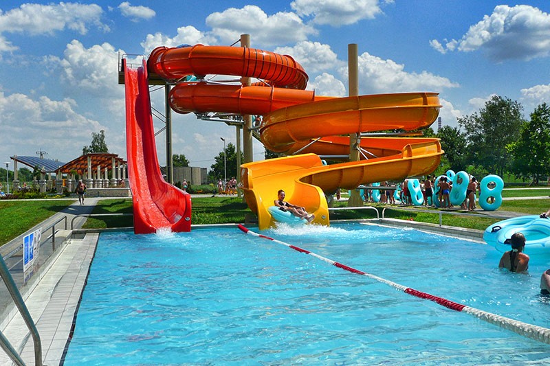Na jednym krańcu basenów znajdują się rury do zjeżdżalnia na pontonach, ale duża kolejka zniechęca do korzystania z nich. Obok mieści się basen leczniczy o bardzo ciekawym wyglądzie. Po drodze mamy atrakcje dla dzieci w postaci łódek i nadmuchiwanej kuli w basenie, trampolin, minigolfa, boiska do siatkówki plażowej oraz najluźniejszy basen pływacki.
