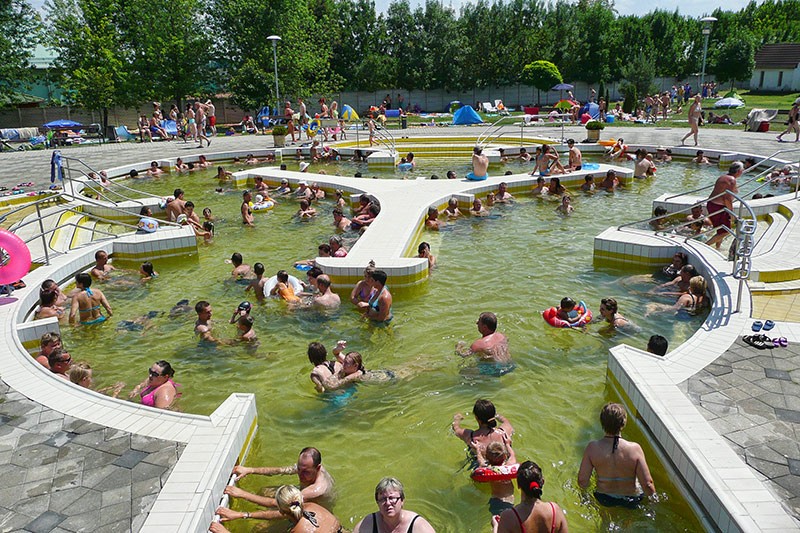 Kompleks basenów dzieli się na kryty i otwarty, ale bilet jest jeden. Pod dachem są 3 baseny lecznicze, którym dokładnie się nie przyglądałem, a na zewnątrz ok. 10 basenów i atrakcji wodnych. Temperatura wody wynosi w zależności od basenu od 26 do 40 st.C. Ludzi cała masa, co jest standardem na Węgrzech, ale tutaj był większy ścisk w basenach niż w Hajduszoboszlo czy Nyiregyhazie-Sosto (choć porównanie mam nieadekwatne, bo w Tiszaujvaros byłem w niedzielę a w pozostałych w dzień powszedni). Najgorzej jest podczas włączania fali i rwącej rzeki. Z tego ostatniego basenu żona z synem na rękach musiała uciekać w obawie przed zgnieceniem albo zadeptaniem!