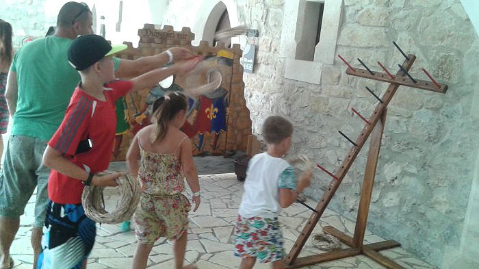 Zamkowe ekspozycje umieszczone są pod lub na wieżach. Jest to przede wszystkim dawne uzbrojenie, stroje rycerskie, machiny oblężnicze, fajna scenka oblężenia, a także pięknie zdobiony gotycki piec Andegawenów. Nie ma tego wiele, ale powinno zainteresować dzieci, przynajmniej naszego malucha zajęło na chwilę.