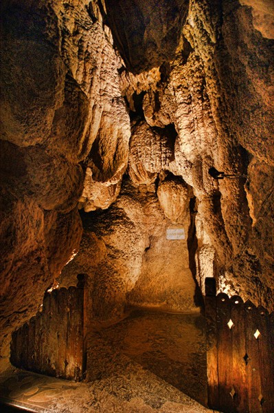 Jaskinię zwiedza się z przewodnikiem przez ok. 25 min. Nasza grupka była niewielka więc było fajnie, bez tłoku. Jest to ważne, bo korytarze w jaskini są wąskie, nie ma w niej wielkich przestrzeni. Najbardziej przypominało mi to podziemną trasę kredową w Chełmie. Oczywiście nic nie rozumieliśmy z tego co mówiła przewodniczka, nie było tez żadnych informatorów dla obcokrajowców. Skupiliśmy więc na oglądaniu ścian jaskini, które posiadają fantastyczną strukturę i zadziwiające nacieki, przy czym nie są to spotykane zwykle w tego typu miejscach stalaktyty i stalagmity, jak wspomniałem ta jaskinia jest trochę inna. Można też zauważyć odciski i skamieliny roślin oraz zwierząt. Ogólnie bardzo nam się podobało. Synowi przydała się latareczka z laserem - miał z nią niezłą zabawę. Korytarze są oświetlone lampkami przy podłożu, a u góry oświetlają tylko miejsca warte oglądnięcia - jest to bardzo dobrze pomyślane. Wędrówka korytarzami jest bezpieczna i panuje przy tym odpowiedni nastrój.
