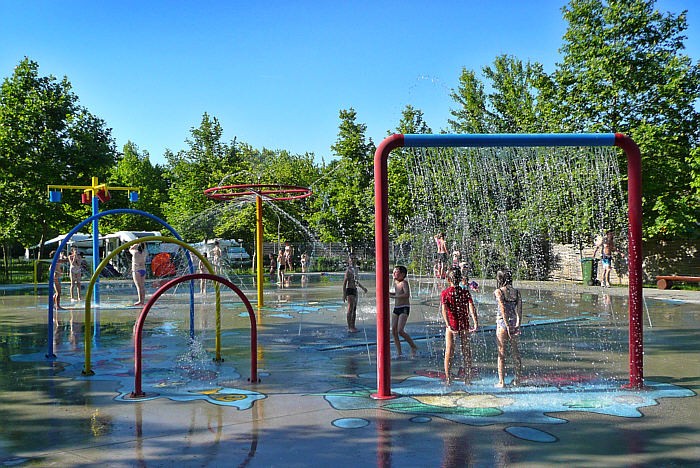 Specjalnie dla dzieci naliczyłem 3 działające atrakcje. Do pływania i chlapania w wodzie jest brodzik z drewnianym mostkiem i niewielkimi zjeżdżalniami. Podzielono go na 2 części: płytką i bardzo płytką. Nic specjalnego, ale był cały czas pełny - maluchy dobrze się tu bawiły. Druga rzecz to betonowy plac wypełniony różnymi prysznicami, rurami z sikawkami, wodotryskami. Pierwszy raz coś takiego widzieliśmy. Fajne dla dzieciaków, którym nie straszne zachlapane oczy. Poza tym jest tradycyjny plac zabaw.